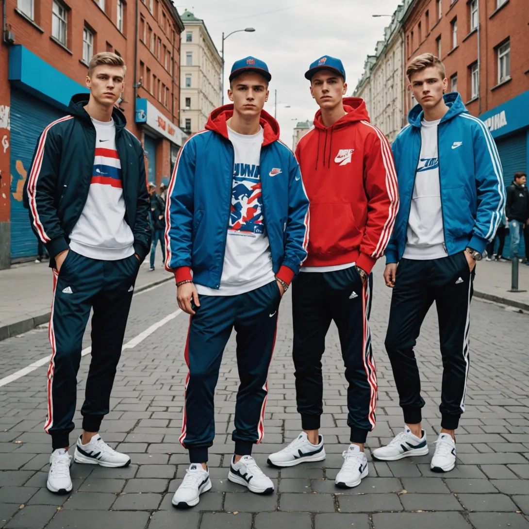 - Визуальный стиль: узнаваемые спортивные костюмы, яркие аксессуары, кроссовки от популярных брендов;